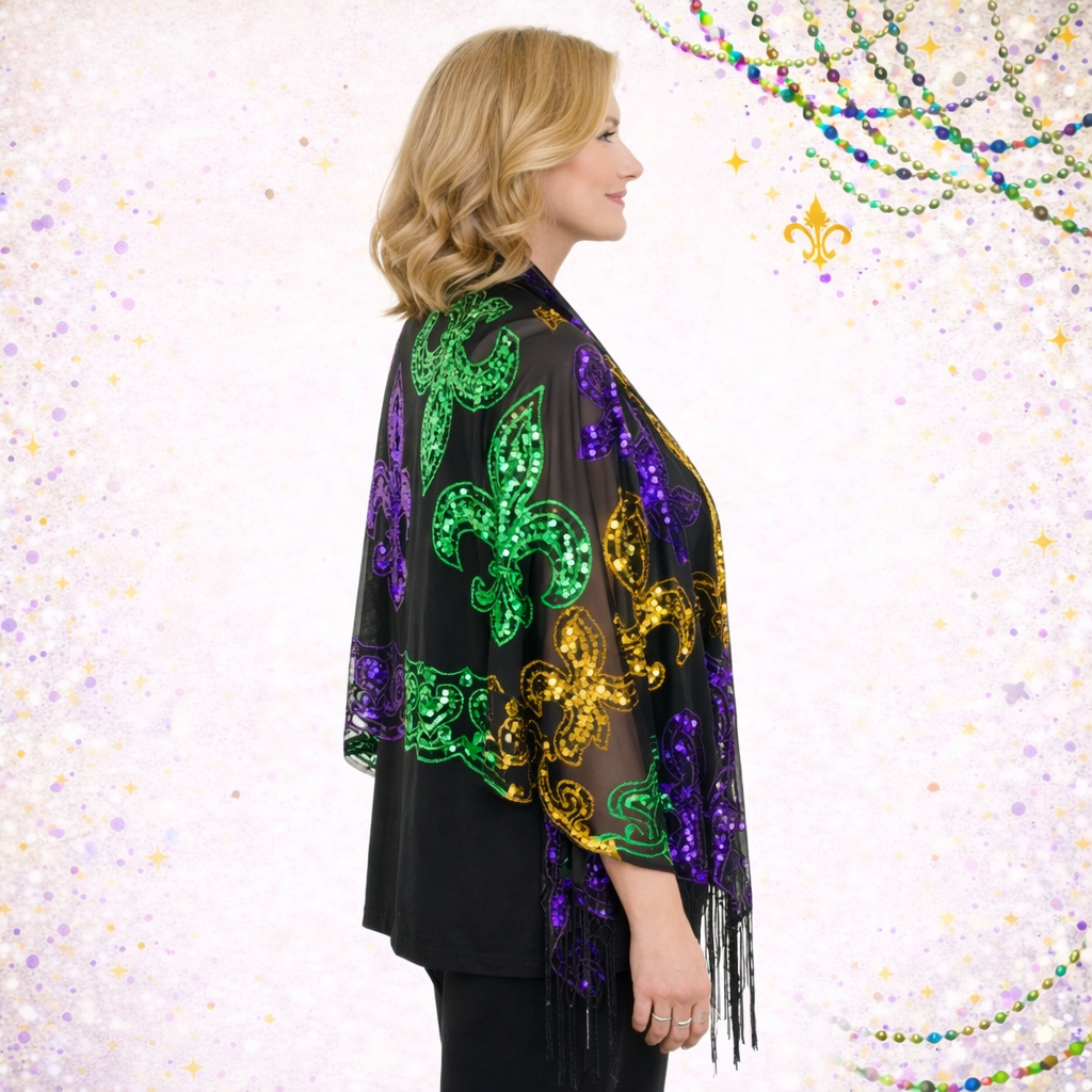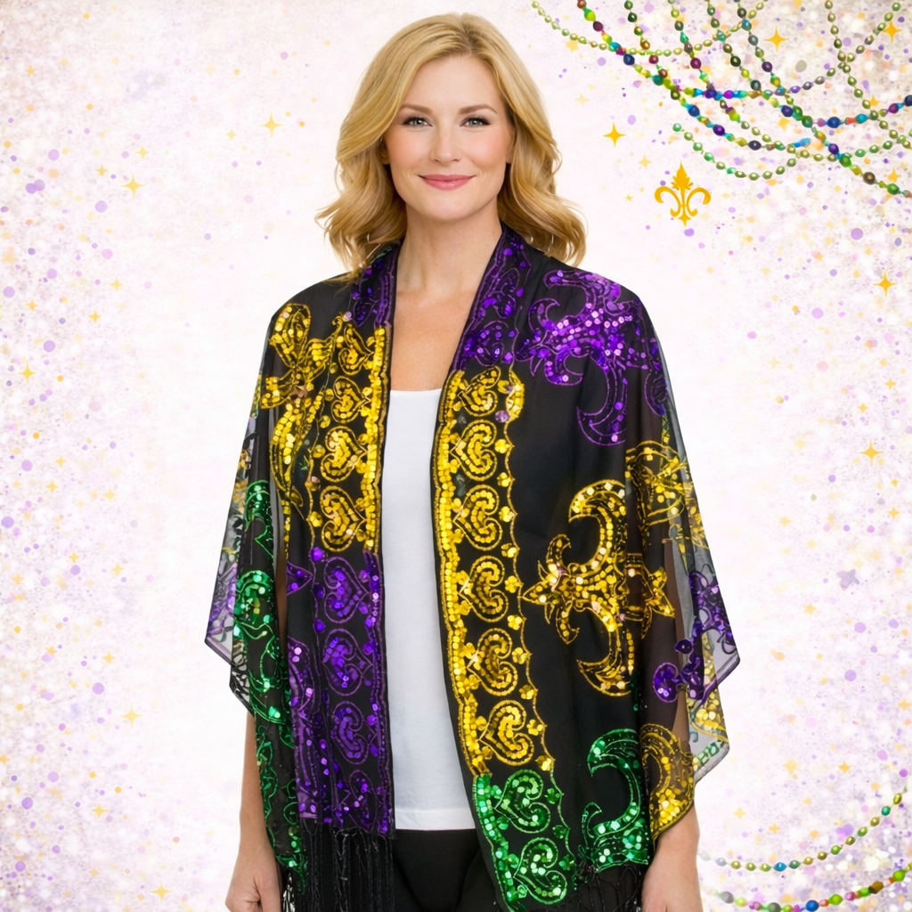 Mardi Gras Fleur De Lis Fringe Sequin Oblong Scarf